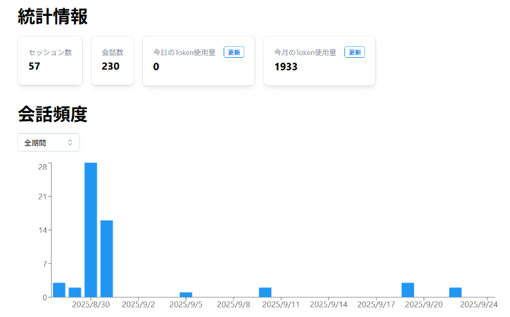 利用者の満足度や不満点を可視化する管理者向けダッシュボード画面を新たに実装しました。これにより、会話ログが“現場改善のための資料”として活用可能になりました。